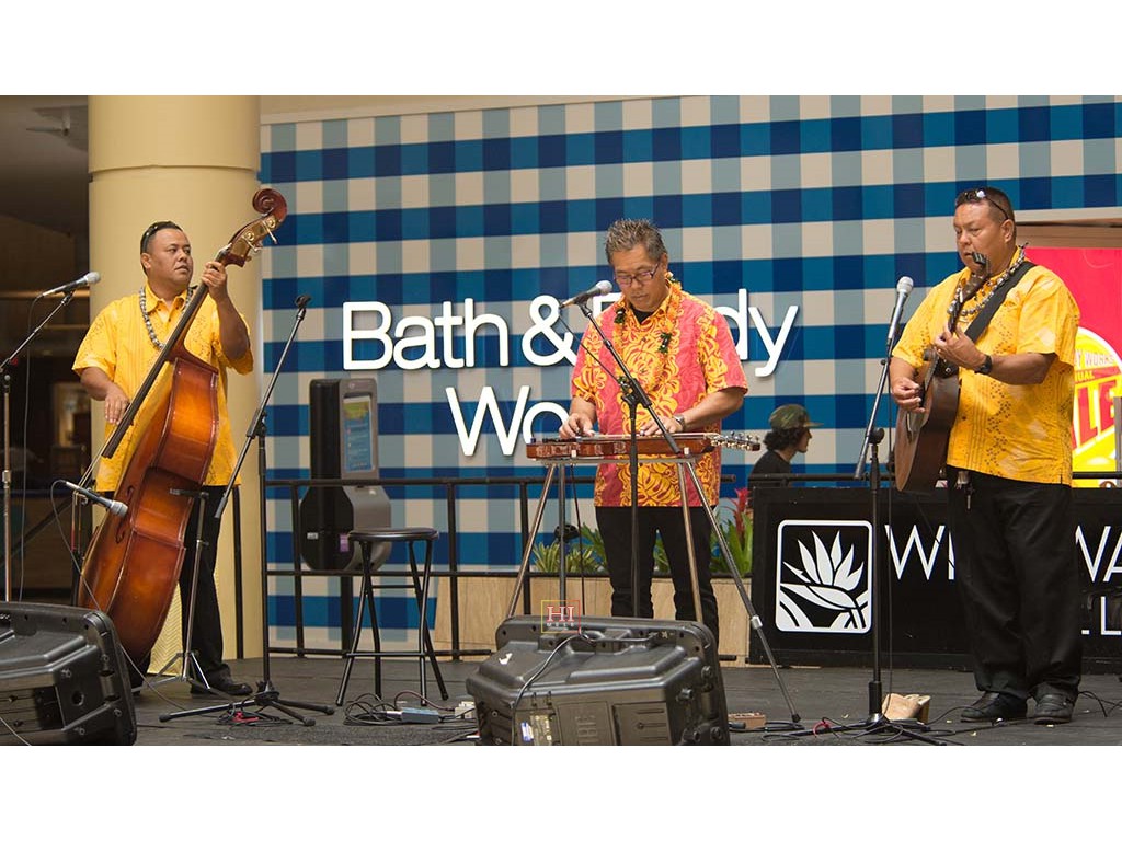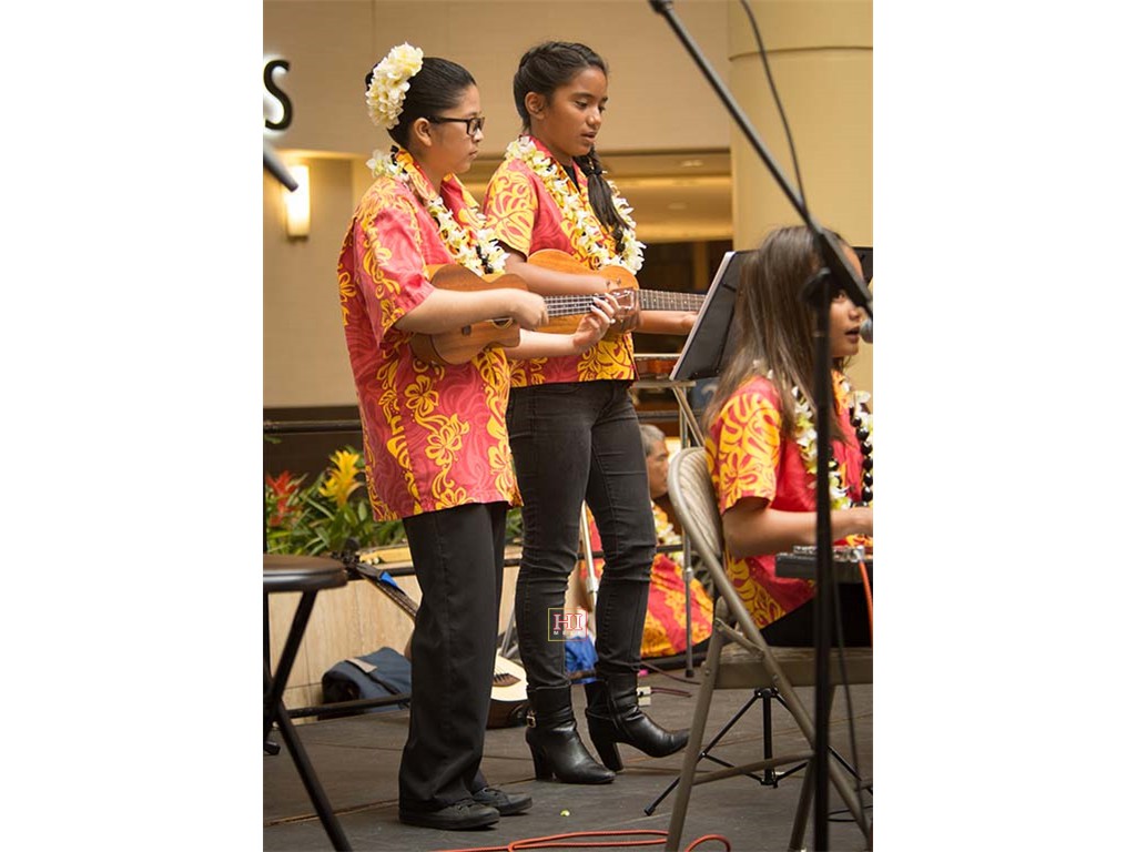 Joey Misailidis plays the steel guitar, accompanied by Alexis Tolentino and Mālie Lyman on ʻukulele.