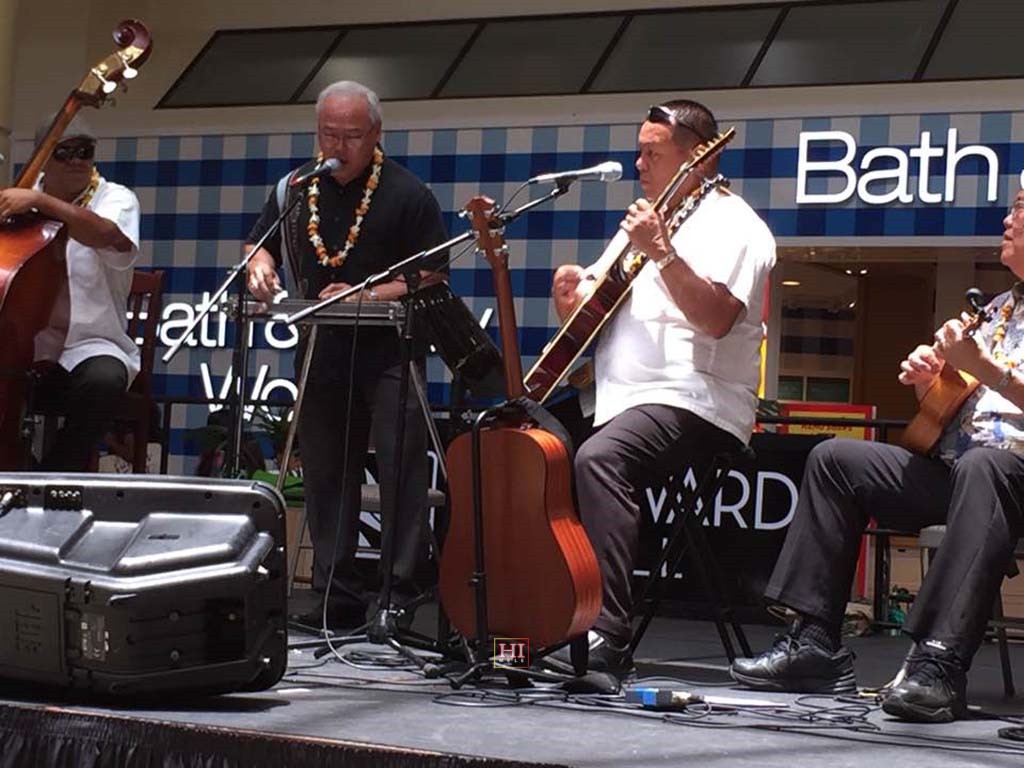 Featured steel guitarist Alan Akaka with Adam Asing, Kaipo Asing, and Bobby Ingano. Photo by Gale Warshawsky.