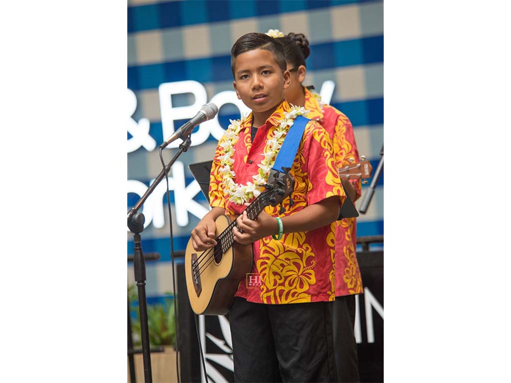 Ke Kula Mele Hawaii students Tai Misailidis on U-bass with Alexis Tolentino playing 'ukulele.