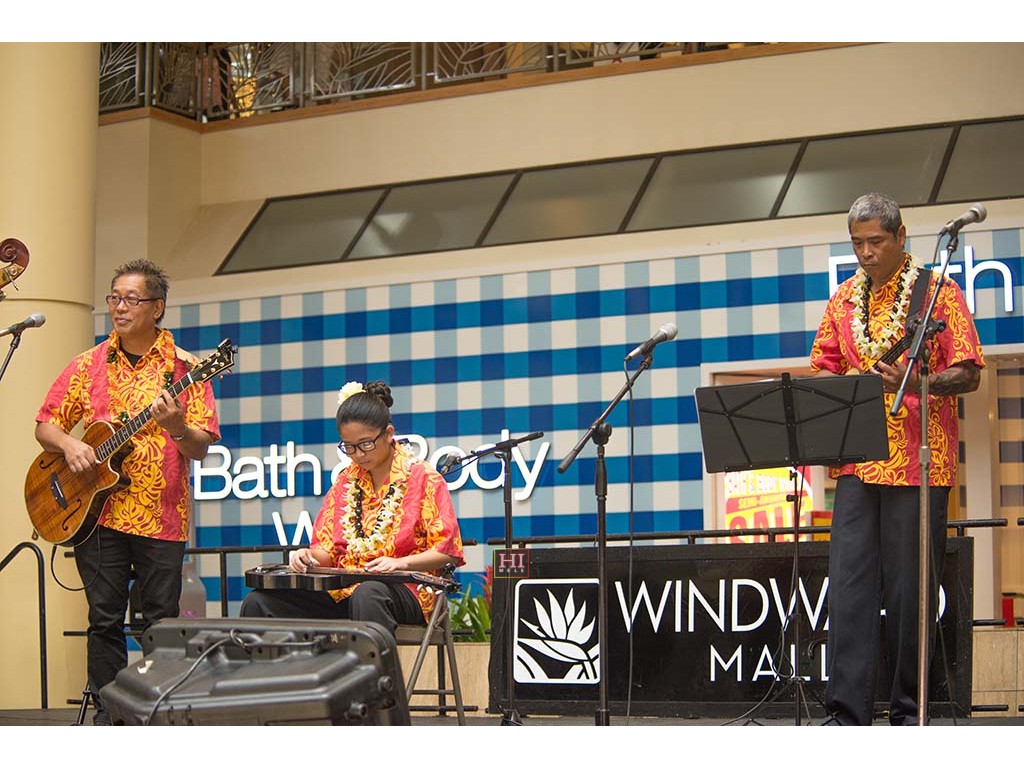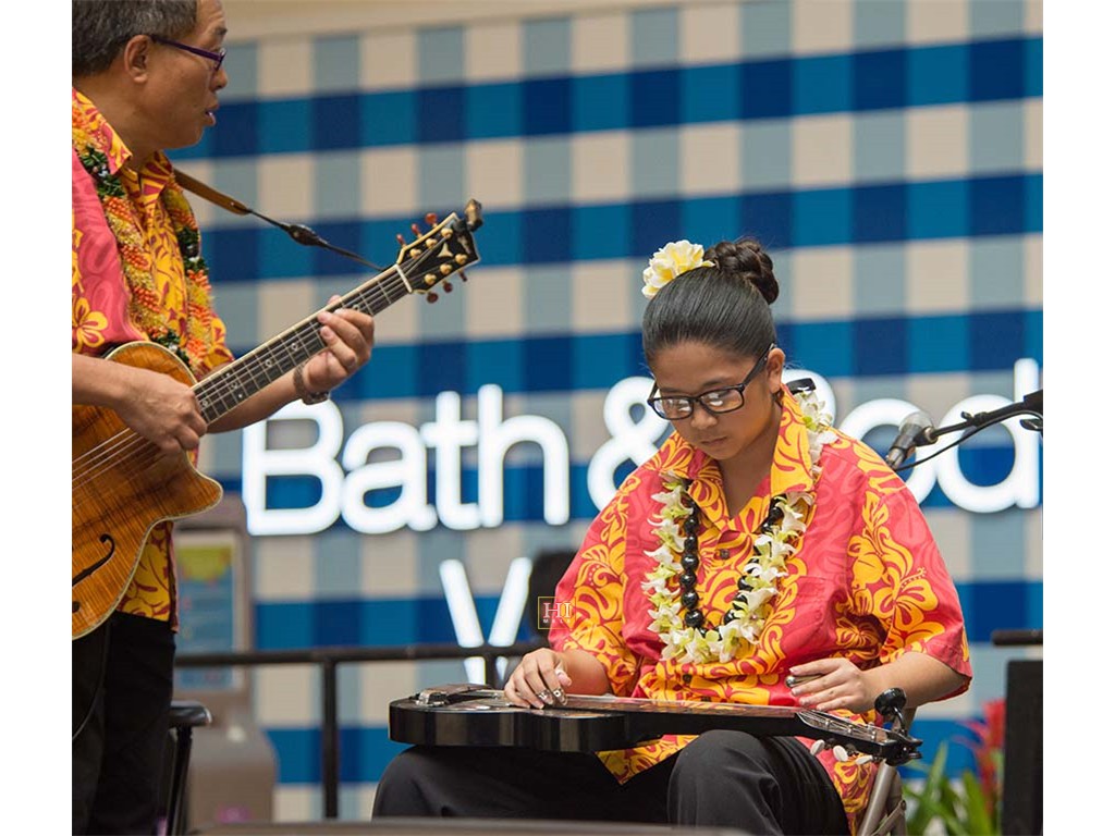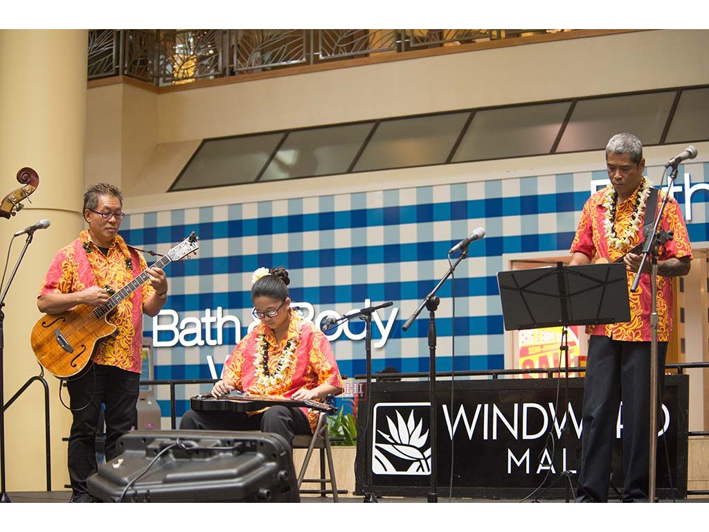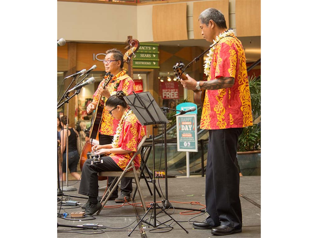 Joey Misailidis plays the steel guitar, accompanied by Alexis Tolentino and Mālie Lyman on ʻukulele.
