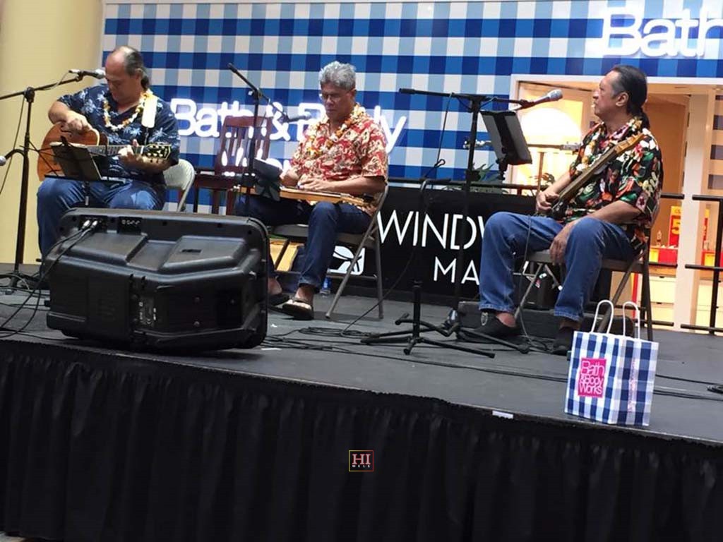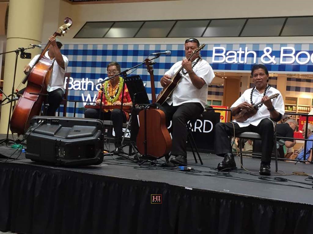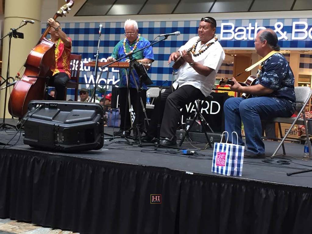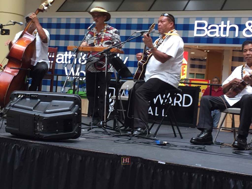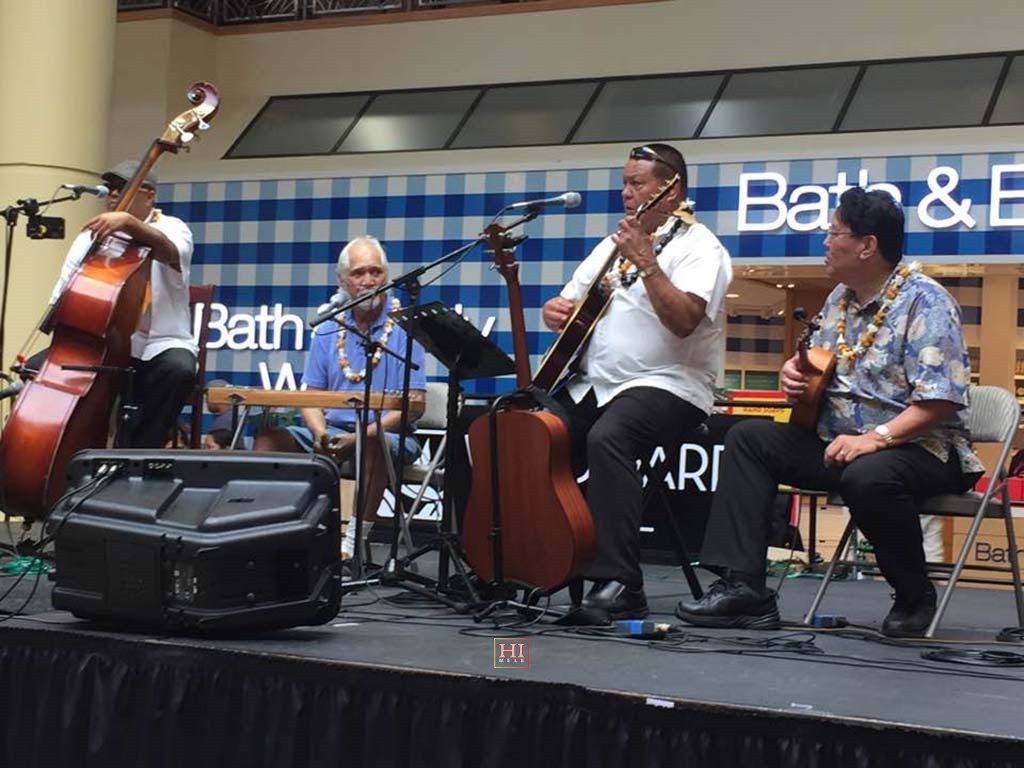 Featured steel guitarist Alan Akaka with Adam Asing, Kaipo Asing, and Bobby Ingano. Photo by Gale Warshawsky.