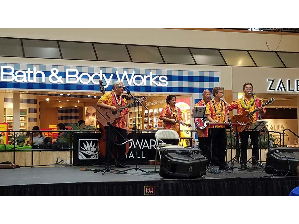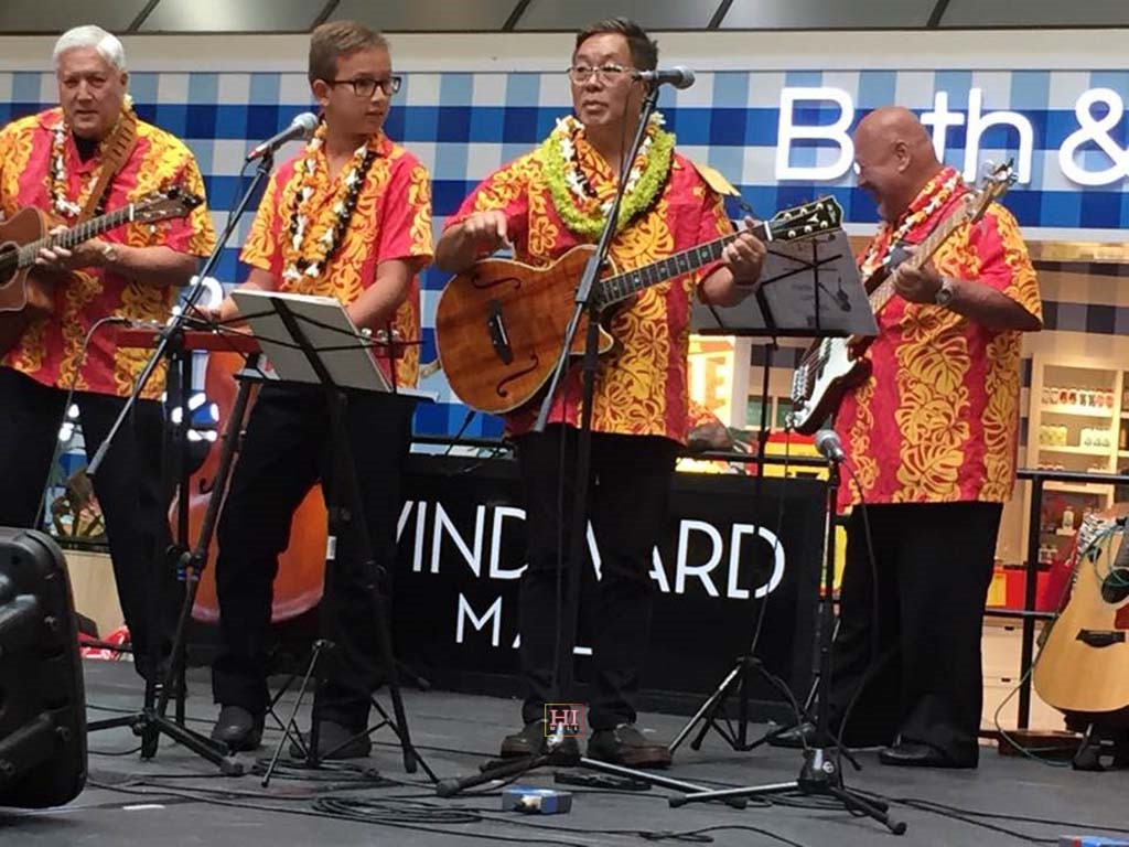Ke Kula Mele Next Generation Steel Guitarist Pono Fernandez with Addison Ching, Alexis Tolentino, Larry Holu, and Alan Akaka. Photo by Sharon Ching.