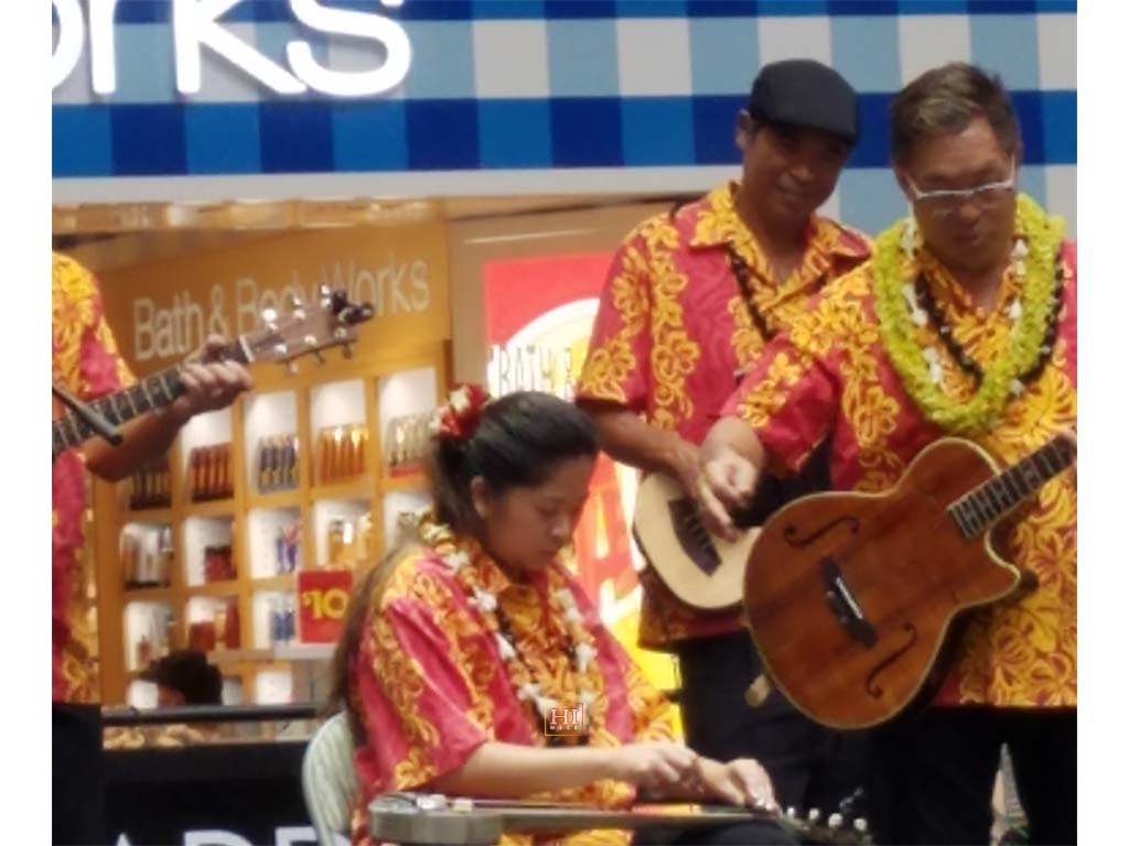 Next generation steel guitarist Alexis Tolentino with Addison Ching, Alan Akaka, Ronald Tolentino, and Pono Fernandez. Photo by Gale Warshawsky.