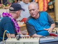 Bob Beard demonstrates the steel guitar to another festival guest.