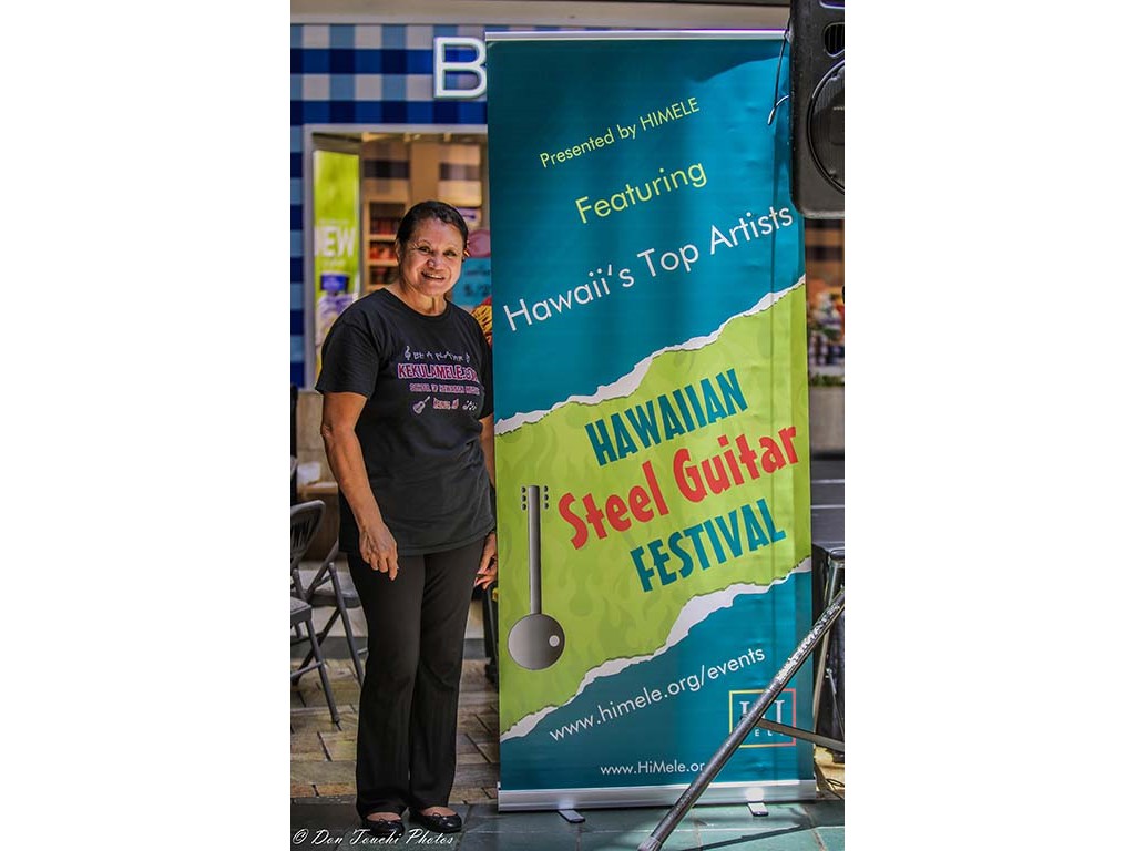 Shirley Holu with Hawaiian Steel Guitar Festival banner #2.