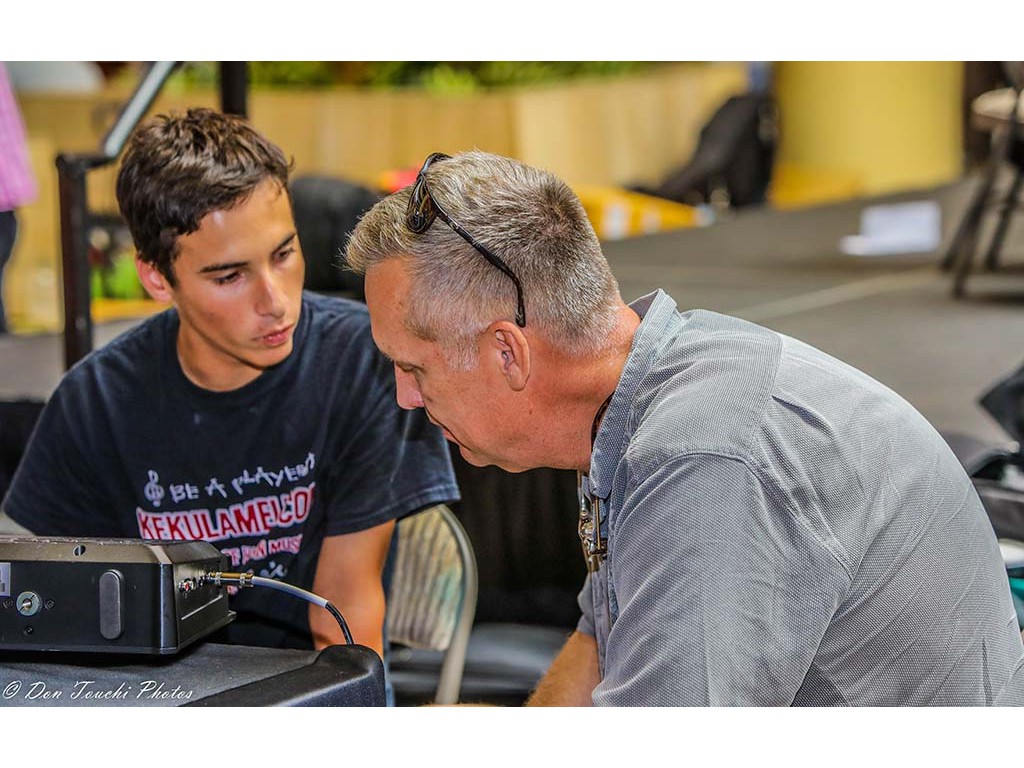 • Heuʻi Bandmann shows a keiki steel player how to hold the slide bar.