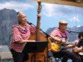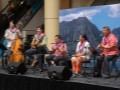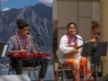 Claude Kutaka demonstrates the steel guitar to a festival guest.